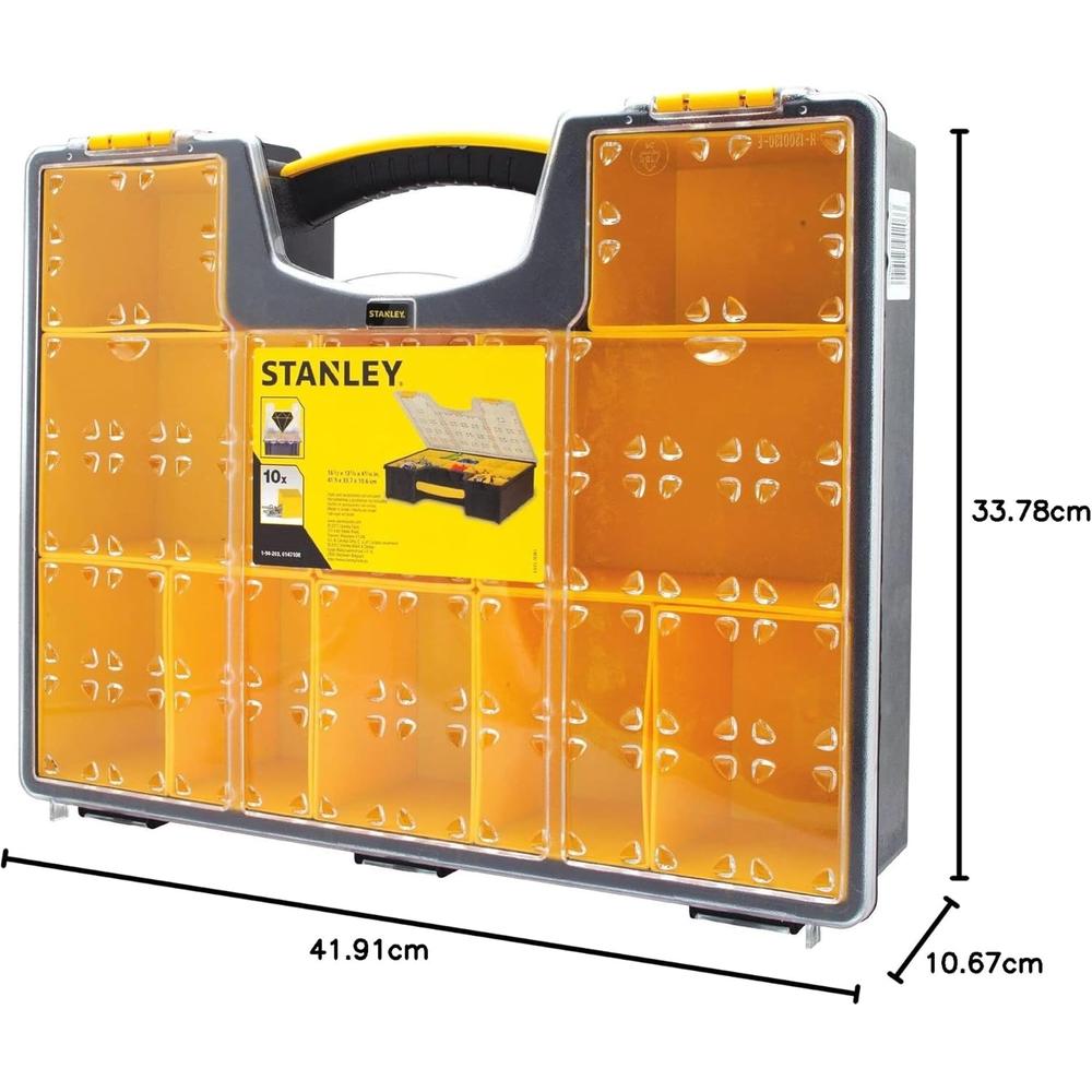 Tout le monde, des charpentiers aux artisans, trouvera une utilisation pour cet organisateur de petites pièces à compartiment professionnel de STANLEY®. Il dispose de 10 compartiments pour tasses qui peuvent être retirés au besoin pour contenir une sélection d'outils, de pièces et de fournitures. Lorsqu'il est fermé, le couvercle transparent verrouille tout en toute sécurité.