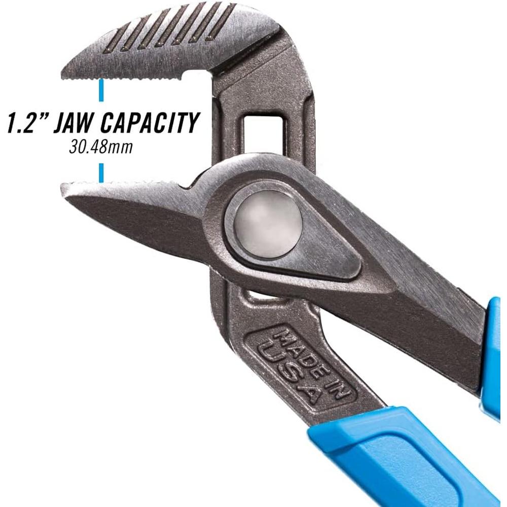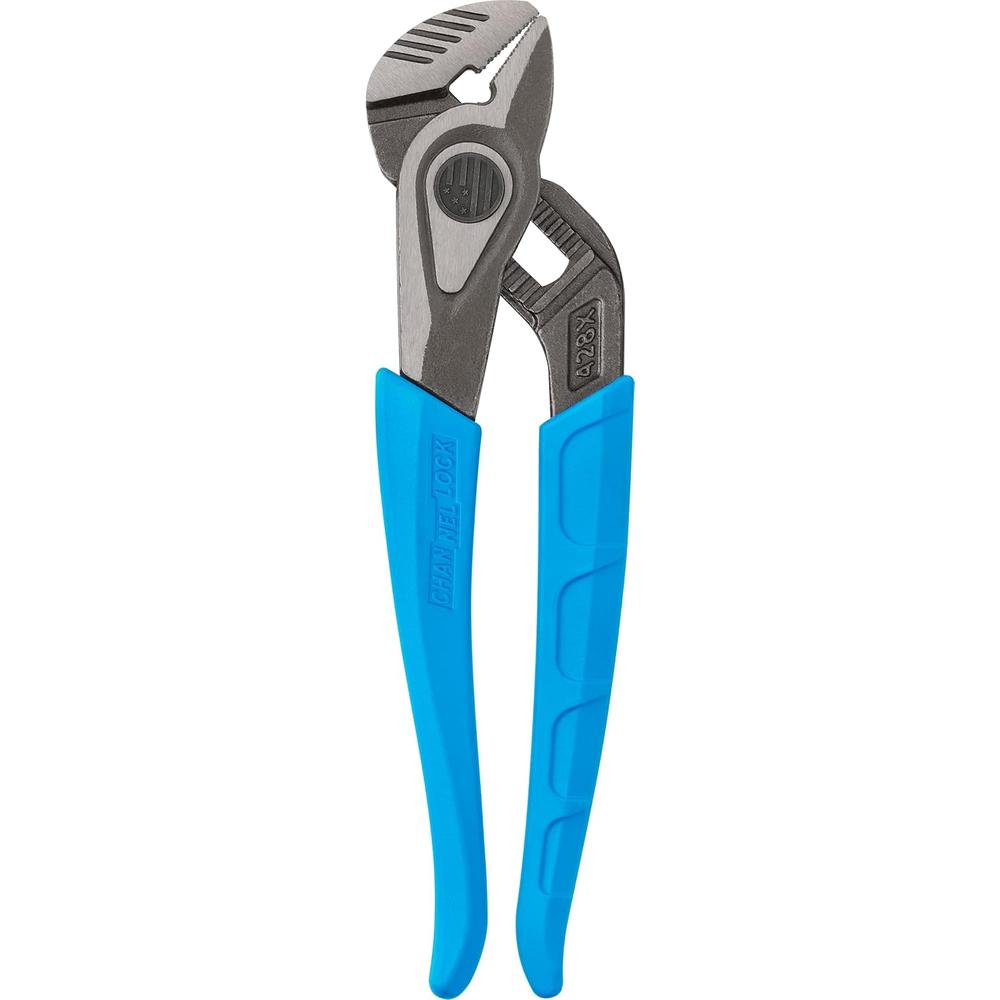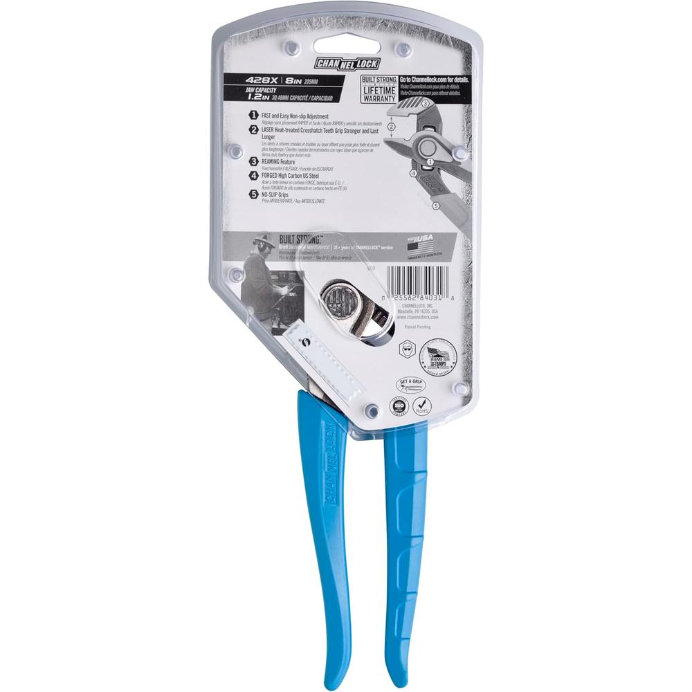 CHANNELLOCK SPEEDGRIP 428X Tongue & Groove Pliers make fast and easy non-slip adjustments so you can get the job done even quicker. Laser-hardened crosshatch teeth grip stronger and last longer thanks to innovative engineering. There is also a reaming feature for easy deburring of pipe. Finally, like all CHANNELLOCK pliers, SPEEDGRIP 428X Tongue & Groove Pliers are made in the USA from high carbon U.S. steel for ultimate strength and have comfort handles with no-slip grips.