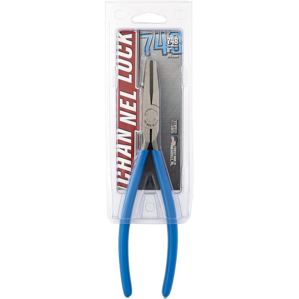 No job is out of reach with CHANNELLOCK Long Reach pliers. Each is specifically designed for those hard-to-get-to jobs. The Channellock 748, 8-Inch End Cutter Long Reach Plier, is designed for long reach applications and for use in confined areas. Its perfectly mated jaws are heat treated to hold its edge. It is precision made of fine polished, high carbon drop forged steel. Channellock Blue comfort grips.