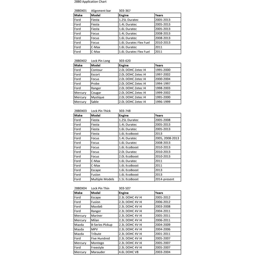 CTA Tools 2880 Camshaft Timing Kit - Ford and Mazda is designed for locking and positioning camshafts, crankshafts and injection pump sprockets when replacing timing belts or chains. The kit includes a setting gauge and 3 different locking pins. For servicing '04 - '09 Mazda 3, '06 - '10 Mazda 5, '05 - '08 Ford Escape, '03 - '07 Ford Focus and '06 - '09 Ford Fusion, including all HWDA, HWDB, & HXDA engines. Heavy-duty construction allows for strength and durability. Whether tuning up your '68 Corvette or changing the oil on a John Deere tractor, CTA can supply you with the tools needed to do the job. California Prop 65 - Warning, This product contains chemicals known to the State of California to cause cancer, birth defects or other reproductive harm.