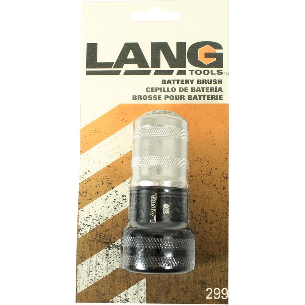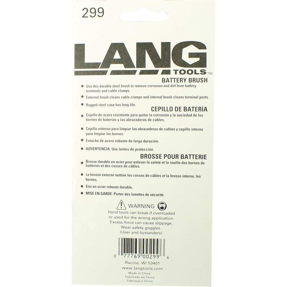 Lang Tools (299) Battery Brush removes corrosion and dirt from battery terminals and cable clamps. With a steel case providing a longer life, the external brush cleans cable clamps while the internal brush cleans terminal posts.