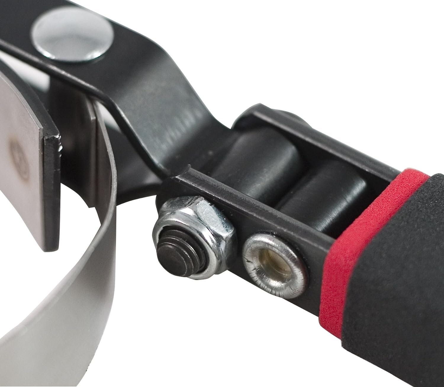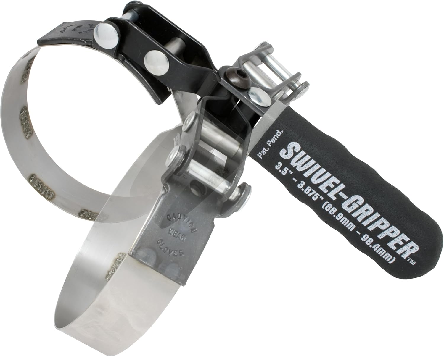 Tough, stainless steel band with permanently bonded textured coating for superior gripping power. Swivel handle makes it easy to turn in tight spots. Handle swivels more than 180 degrees with adjustable tension. Tension adjusting nut allows swivel pressure to be regulated. Patent pending coating process adds many additional gripping points to securely grab the filter. Specially designed tab keeps grip from sliding off the handle. Has a 2.375 to 2.625 (60.3 to 66.7 mm) range. For small oil and fuel filters. Special narrow 1/2 inch band fits in tight spots.