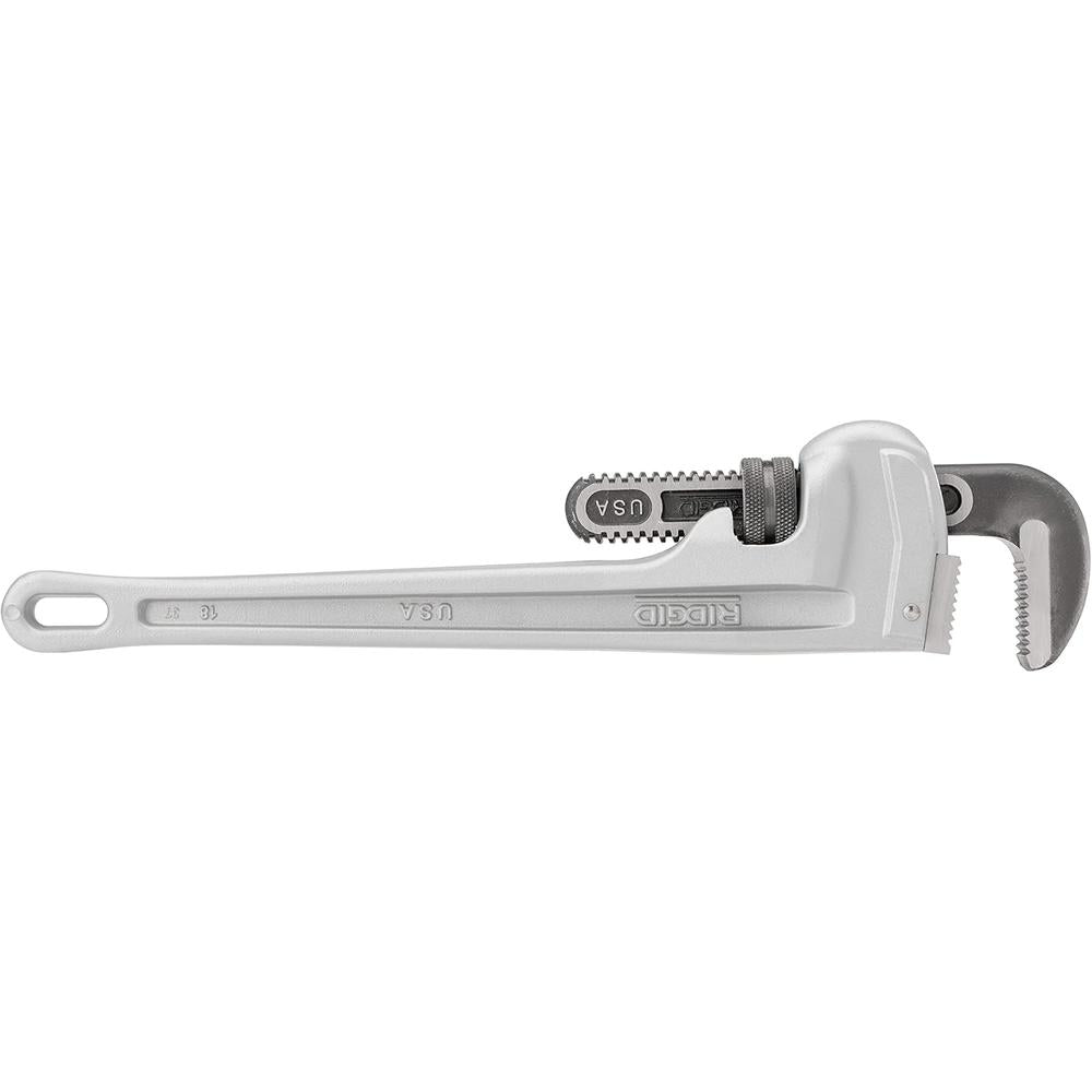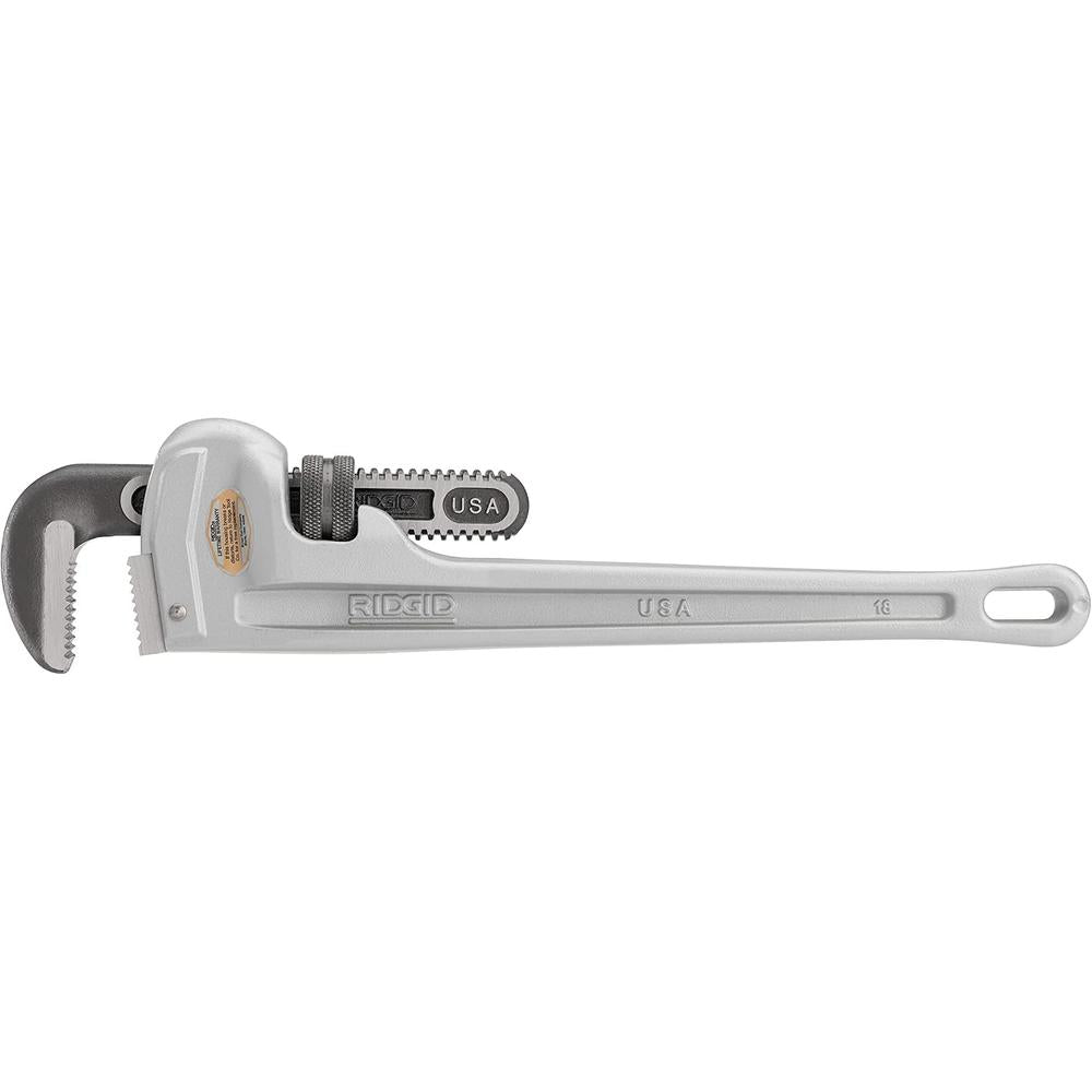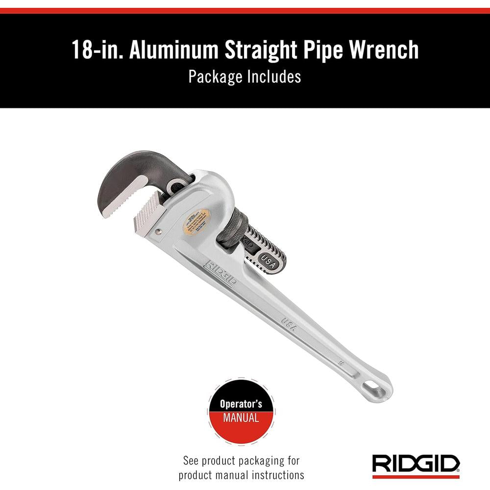A handy addition to any toolbox, the RIDGID 31100 Model 818 Straight 18-Inch Aluminum Pipe Wrench is a plumbing wrench that offers professional strength and quality in a convenient, lightweight tool. Nearly 40 percent lighter than comparable iron models, it delivers the unsurpassed durability and ease-of-use that all RIDGID heavy-duty wrenches are known for.The aluminum pipe wrench has a sturdy I-beam handle with quickly adjustable full floating forged hook jaw. The jaw features self-cleaning threads and easily replaceable spring assembly, hook jaw and heel jaw for long-lasting use. A non-stick adjustment nut cleans away grime from the hook jaw shank for reliable tool use.This 18-inch straight pipe wrench is ideal for pipe diameters of 1 inch to 2 inch with a capacity of up to 2-1/2 inches, and is suitable for all types of pipe work.RIDGID covers its products with a lifetime warranty against defects in material or workmanship for the life of the tool.Since 1923, RIDGID has remained the symbol of certainty to dedicated professionals of the expert trades. Every tool that bears the RIDGID brand is engineered to the same high standards of quality, strength and endurance, as was that first heavy-duty pipe wrench more than 80 years ago.Aluminum Straight Handle Pipe Wrench. Sturdy housing and I-beam handle with full floating hook jaw, non-stick adjustment nut and replaceable hook and heel jaws. These Aluminum pipe wrenches are nearly 40% lighter than comparable cast-iron models of the same size. Pipe capacity: 2-1/2 . Weight: 3-3/4 lbs.