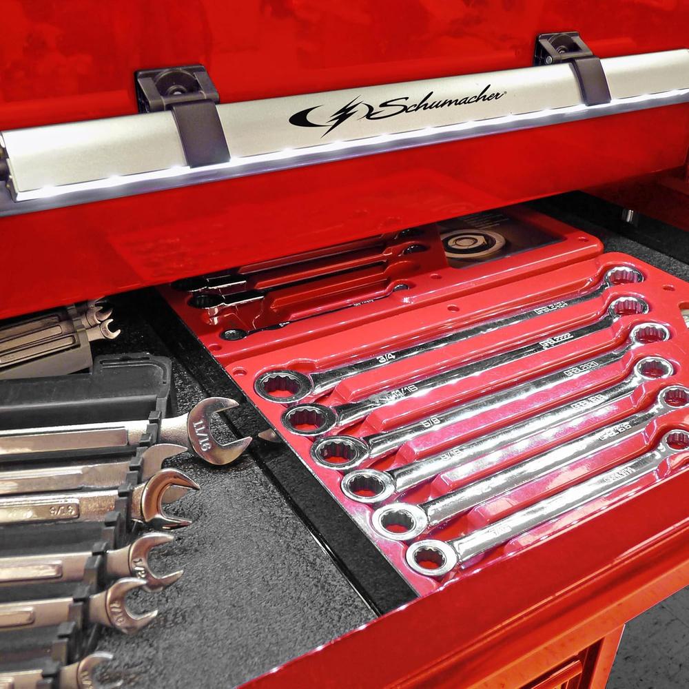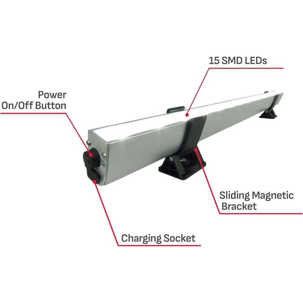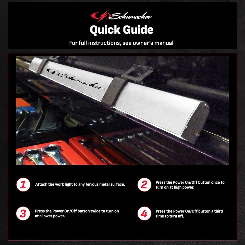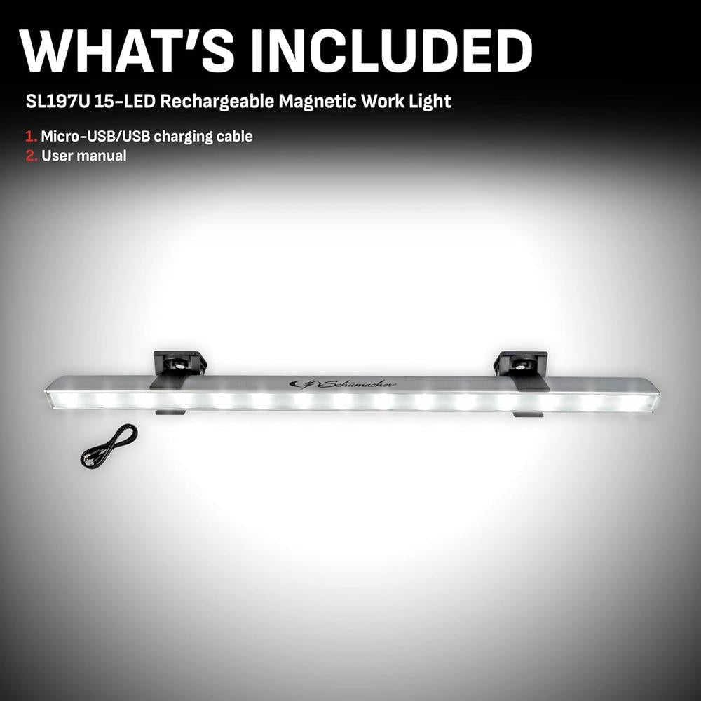 Schumacher's SL197U Rechargeable Magnetic Mount Work Light has adjustable brackets that allow for 180? rotation. Two sliding magnetic brackets rotate to direct the light as needed and attaches to any ferrous metal surface. The 2200mAh rechargeable lithium ion battery allows for 12 hours of operations and charge LED indicators allow you to know when the levels are getting low. Durable aluminum housing is great for working on any project.