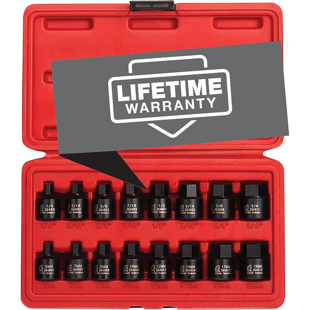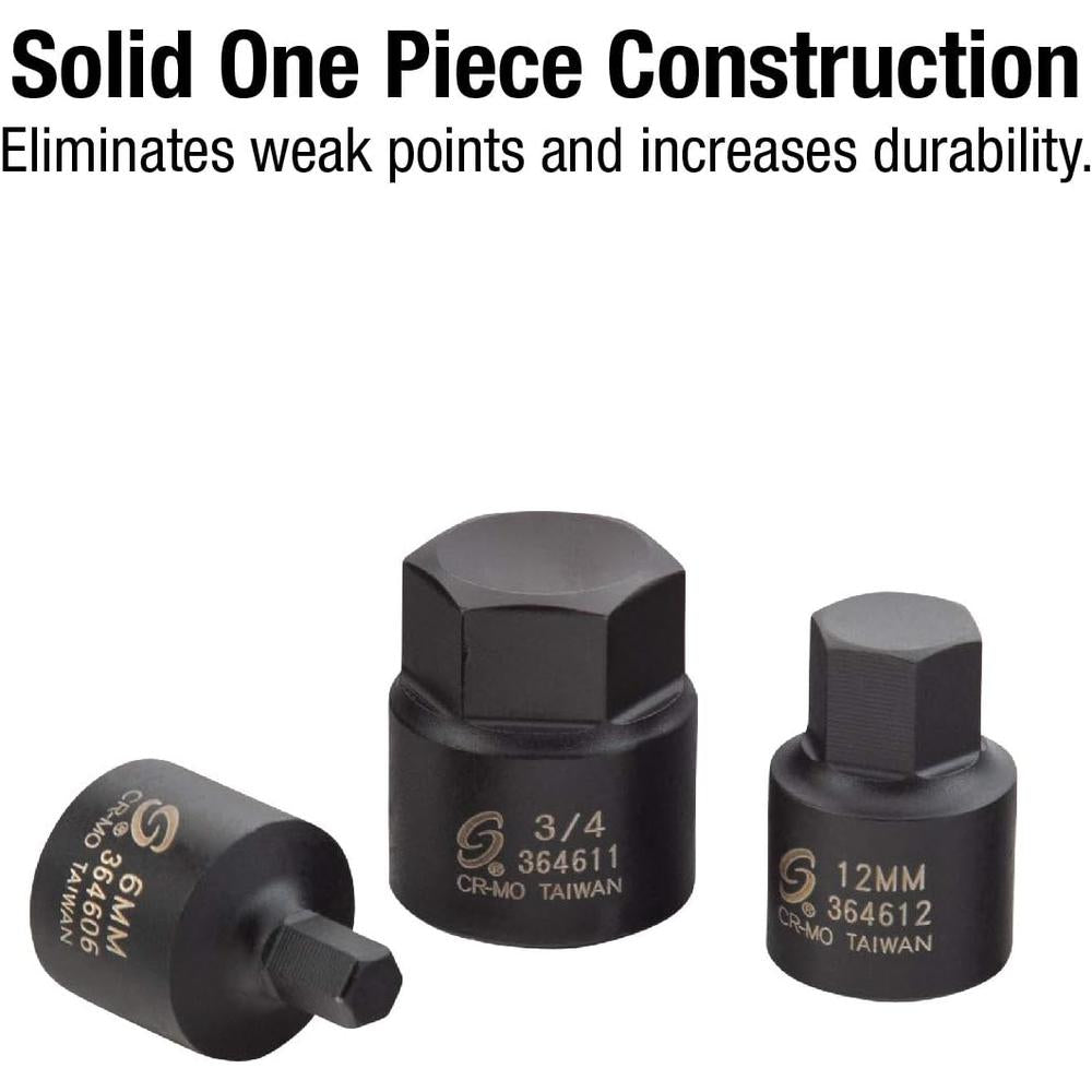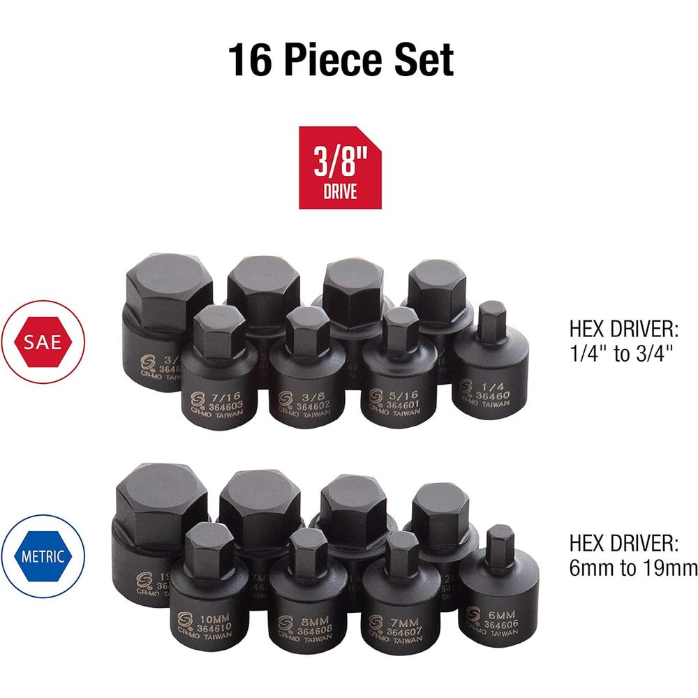 Sunex 3646. 3/8 Inch Drive Low Profile Impact Hex Driver Set. 16-Piece. SAE/Metric. 1/4 Inch - 3/4 Inch. 6mm - 19mm. Cr-Mo Steel. Dual Size Markings. Heavy Duty Storage Case. Meets ANSI Standards