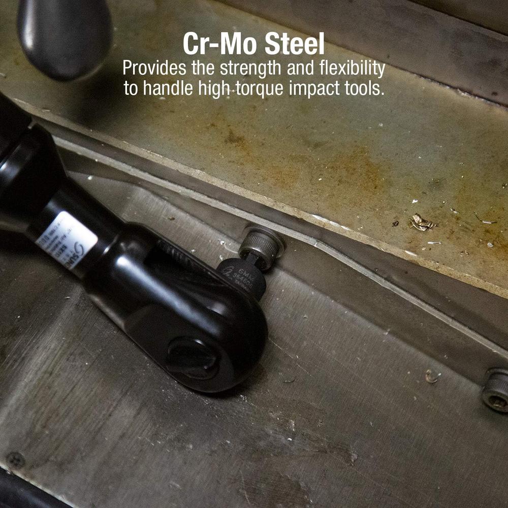• Cr-Mo steel: provides the strength and flexibility to handle high torque impact tools