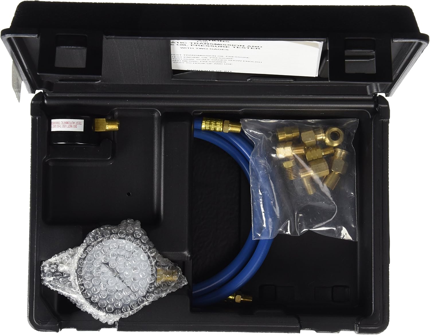 Check oil pressure in automatic transmissions and engines. Adapters provide coverage of most domestic and imported cars and light trucks including late models. This kit contains two gauges, large and small. The large gauge can be used for all applications and has a hang up hook. Use the small gauge for more accurate reading of the engine oil pressure where maximum oil pressure does not exceed 50 PSI (3.5 BAR). This kit is stored in a durable case that measures 11-1/4" x 7-1/2" x 3" and has ample space for additional adapters and parts.